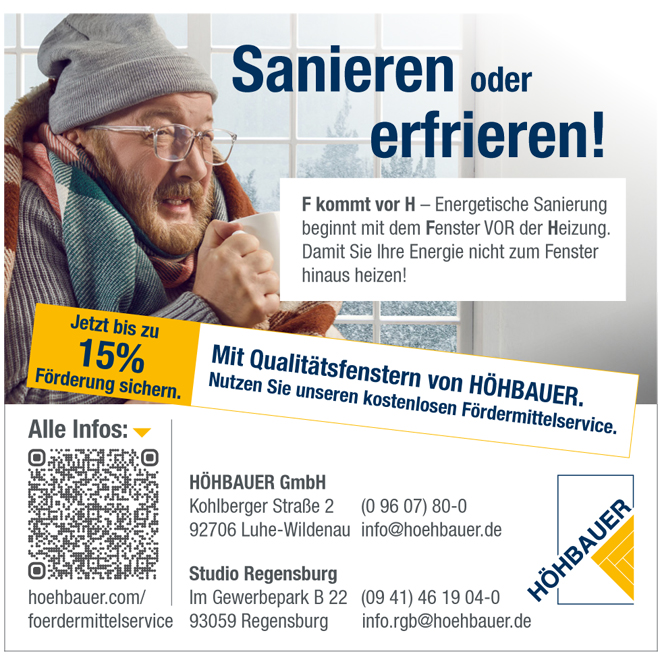 HÖHBAUER bietet maßgeschneiderte Lösungen für jeden Anspruch, vom klassischen Holzfenster bis zum modernen Holz-Aluminium-Fenster oder Kunststoff-(Aluminium)-Systemen. Jedes Fenster wird individuell geplant, in eigener Fertigung am Standort Luhe-Wildenau produziert und professionell montiert – für perfekte Ergebnisse aus einer Hand. Ergänzt wird das Sortiment durch Haustüren und Wintergärten in zahlreichen Ausführungen sowie passgenaue Lösungen für Sicherheit und Einbruchschutz.