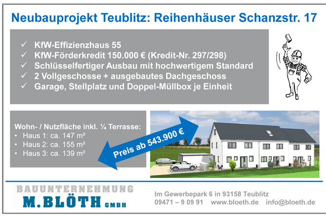 Auf der REGIONALE in Burglengenfeld präsentiert sich das Bauunternehmen im Außenbereich und gewährt spannende Einblicke in seine Arbeit. Besucher können sich unter anderem über aktuelle Verkaufsprojekte informieren, darunter die Reihenhäuser in der Schanzstraße in Teublitz.
