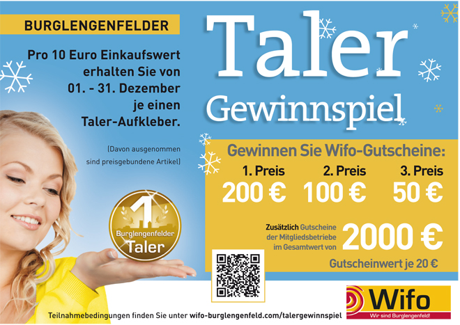 Immer wieder ein Sammelspaß für Groß und Klein, im Handel und der Gastronomie in der Innenstadt und im Naabtalcenter! „Noch nie gab es mehr zu gewinnen als in diesem Jahr“, so WIFO-Vorsitzender Imad Cheikho. „Ich freue mich vor allem auch sehr, dass sich wieder zahlreiche WIFO-Mitgliedsbetriebe an unserer beliebten Aktion beteiligen.“ Neu in diesem Jahr: An den Advents-Samstagen werden die Taler verdoppelt!