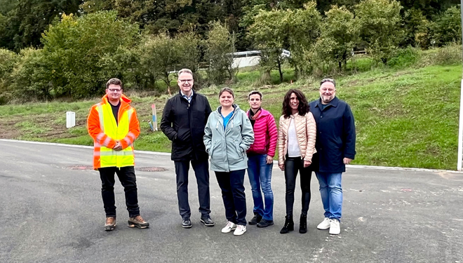 Beim Abnahmetermin verschafften sich Bürgermeister Thomas Beer, Bauamtsleiterin Sabine Eichinger, die zuständigen Bauamtsmitarbeiterinnen Anna Diel und Doris Janus sowie Stephan Strauß, Josie Weichmann und Andreas Sebast vom Ingenieurbüro gemeinsam mit Martin Sommer von der ausführenden Tiefbaufirma ein Bild von der erfolgreichen Fertigstellung der Erschließung des Baugebiets.