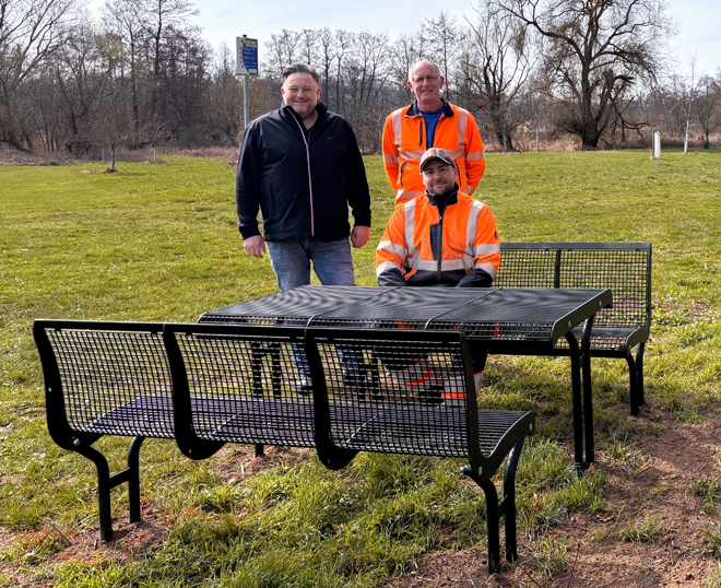 Die Sitzgruppe wurde durch Mitarbeiter des städtischen Bauhofs unter der Leitung des stellvertretenden Bauhofleiters Andreas Kobler befestigt und aufgestellt. Sie besteht aus einem Tisch sowie zwei Sitzbänken und ist in der Farbe Tannengrün (RAL 6009) gehalten, sodass sie sich harmonisch in die Umgebung einfügt.