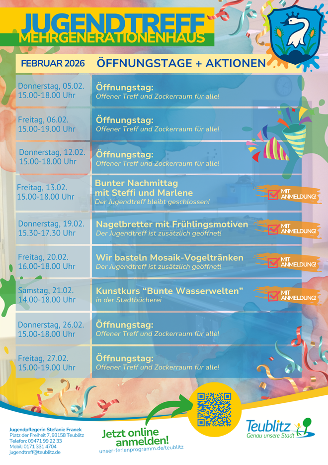 TEUBLITZ (sr). Auch im Februar lädt der Kinder- und Jugendtreff im Mehrgenerationenhaus Teublitz alle Kinder und Jugendlichen zu einem abwechslungsreichen Programm ein – der Fasching hält im Mehrgenerationenhaus Einzug. Neben den offenen Treffzeiten mit Billard, Dart, Tischtennis, Kicker, Gesellschaftsspielen und dem beliebten Zockerraum mit PlayStation 5 warten wieder kreative Aktionen und besondere Highlights auf euch.