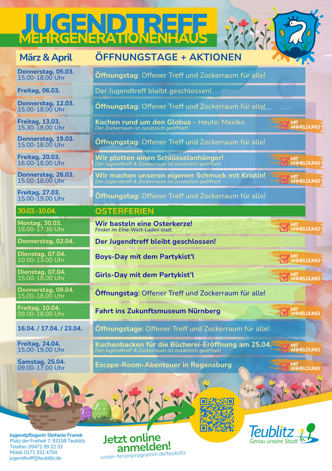 TEUBLITZ (sr). Auch im März und April 2026 lädt der Kinder- und Jugendtreff im Mehrgenerationenhaus wieder zu einem abwechslungsreichen Frühlingsprogramm ein. Neben den offenen Treffzeiten mit Billard, Dart, Tischtennis, Kicker, Gesellschaftsspielen und dem beliebten Zockerraum mit PlayStation 5 warten kreative Aktionen, gemeinsame Ausflüge und spannende Ferienangebote auf euch.
