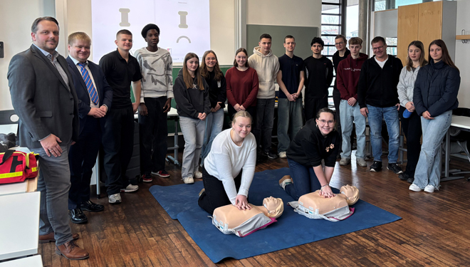 Die Schule setzt bereits seit Jahren auf ein eigenes Ersthelfer-Team. Die Jugendlichen werden bei kleinen Notfällen – etwa Schürfwunden oder plötzlicher Übelkeit – über Funkgeräte alarmiert und leisten schnelle Unterstützung. Während der Übungseinheiten war deutlich zu sehen, wie routiniert viele von ihnen inzwischen sind: Mit ruhigen, präzisen Bewegungen trainierten sie die korrekte Herzdruckmassage, eine zentrale Maßnahme im Ernstfall.
