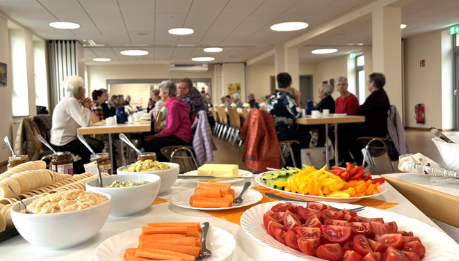 Im liebevoll dekorierten Bürgersaal des Mehrgenerationenhauses wurden unter anderem frischer Kaffee, Brot und Semmeln, Aufstriche, Haferflocken, Marmeladen und Eier angeboten – alles Produkte aus fairem Handel oder aus der Fair-Trade-Region Städtedreieck. Die Gäste ließen sich die Leckereien in geselliger Runde schmecken und nutzten die Gelegenheit zum Austausch.