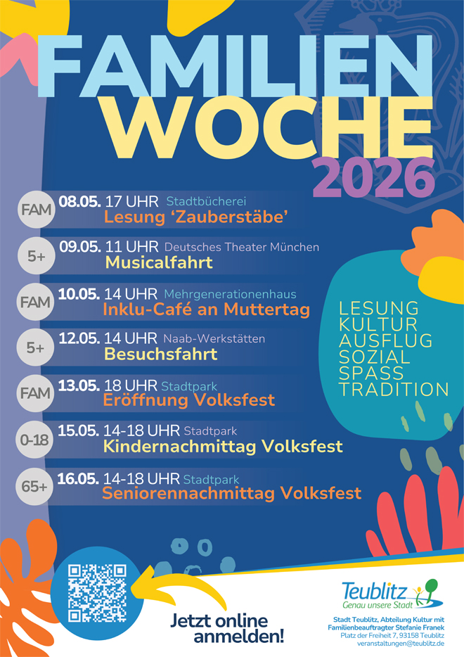 TEUBLITZ (sr). Vom 8. bis 16. Mai 2026 findet erneut die landkreisweite Familienwoche auch in Teublitz statt. Geboten sind verschiedene Aktionen und Angebote aus den Kategorien „Lesung, Kultur, Ausflug, Sozial, Spaß und Tradition“. Familien, Kinder, Jugendliche und auch Senioren können sich auf ein abwechslungsreiches Programm mit vielfältigen Aktivitäten freuen.