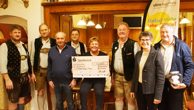 ZEITLARN/BRENNBERG (sr). Einen Spendenscheck über 3000 Euro überreichte die Blasmusikkapelle „De Unsern“ am 4. Februar 2026 im Gasthaus zur Burg in Brennberg an den vkm Regensburg für das Therapieprojekt Theo Ostbayern. 2700 Euro hatte Alois Ederer beim vierten Musikantentreffen am 4. Januar im Gasthaus zur Burg von den rund 150 Besuchern gesammelt. Linda Griesbeck vom Gasthaus Zur Burg hat den Betrag dann noch aufgerundet.
