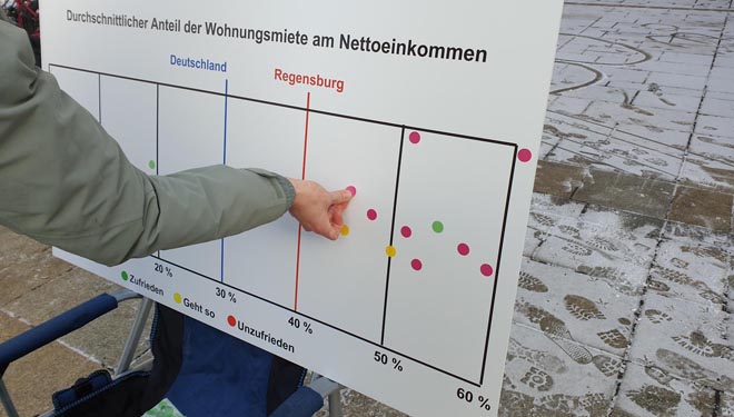 Besonders groß war das Interesse an der interaktiven Station, die die eigene Mietbelastung visualisierte. Am Freitag gab der Durchschnitt der Besuchenden an, rund 40 % des eigenen Haushaltseinkommens für Miete auszugeben. Das entspricht auch dem Wert, den eine DIW-Studie für Regensburg insgesamt ermittelt hat – und liegt damit deutlich über dem bundesweiten Durchschnitt von etwa 30 %.