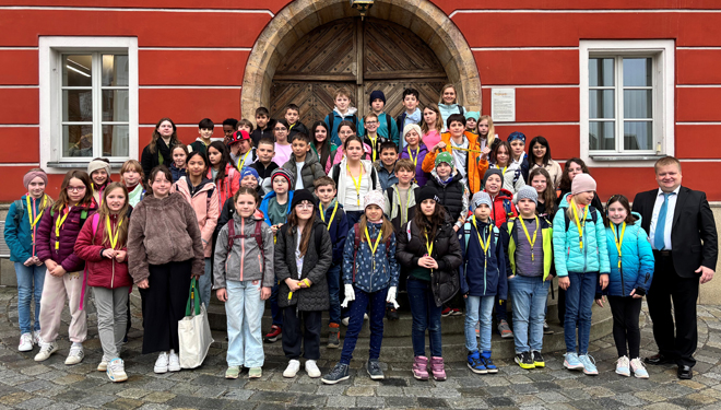 Die Schülerinnen und Schüler waren gemeinsam mit ihren Klassenleiterinnen Gerlinde Schrödinger und Anna-Lena Hildebrand zu einer praxisnahen Unterrichtseinheit in die Stadtverwaltung gekommen.
