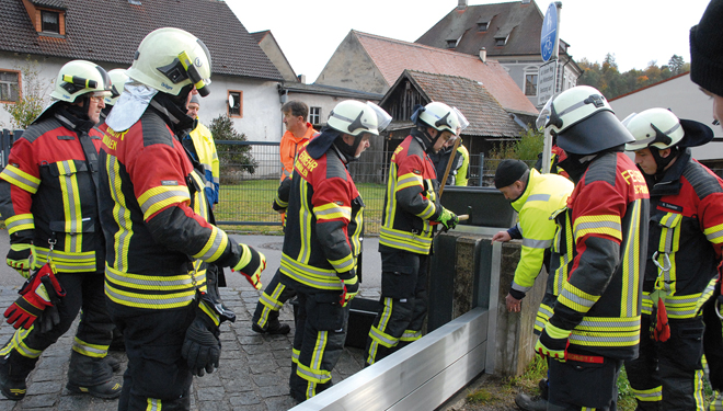 Um im Ernstfall schnell und sicher reagieren zu können, führen Feuerwehr und Wasserwirtschaftsamt regelmäßig Übungen durch. Bei einer kürzlich abgehaltenen Übung trainierte die Feuerwehr Schmidmühlen gemeinsam mit Kreisbrandinspektor Armin Daubenmerkl, Kreisbrandmeister Jürgen Ehrnsberger sowie Vertretern des Wasserwirtschaftsamts Weiden, darunter Sachgebietsleiter Stefan Grünauer, Flussmeister Christoph Gollwitzer und Anlagenbetreuer Bernd Liebl. Dabei wurde exemplarisch ein Hochwasserverschluss aufgebaut.