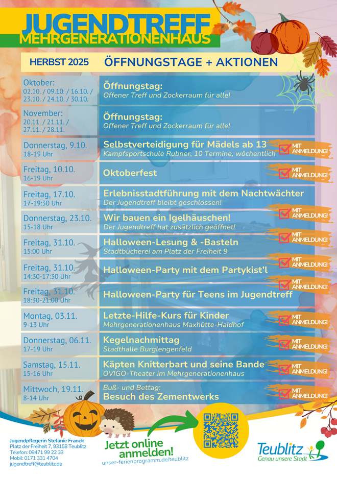 Darüber hinaus gibt es ein abwechslungsreiches Herbstprogramm mit vielen Highlights: Am 9.10. startet ein Selbstverteidigungskurs für Mädchen ab 13 Jahren (18–19 Uhr, Kampfsportschule Rubner, 10 Termine). Am 10.10. feiern wir gemeinsam im Jugendtreff ein kleines Oktoberfest (16–19 Uhr). Eine spannende Nachtwächter-Erlebnisführung durch Burglengenfeld erwartet euch am 17.10. (17–19:30 Uhr, Treffpunkt Europaplatz). Kreativ wird es am 23.10., wenn wir von 15–18 Uhr im Jugendtreff ein Igelhäuschen bauen.