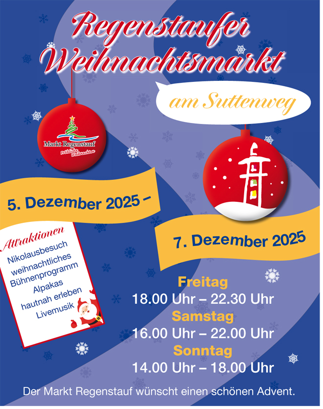 REGENSTAUF (sr). Am zweiten Adventswochenende erleben Besucherinnen und Besucher am Suttenweg-Parkplatz wieder das bezaubernde Flair des Regenstaufer Weihnachtsmarkts: Vom 5. bis 7. Dezember 2025 verlockt hier ein romantisches Weihnachtswunderland zum Bummeln und Genießen. Weihnachtlich dekorierte Buden, funkelnde Lichter und der Duft von süßen und deftigen Weihnachtsleckereien stimmen auf die Vorweihnachtszeit ein.