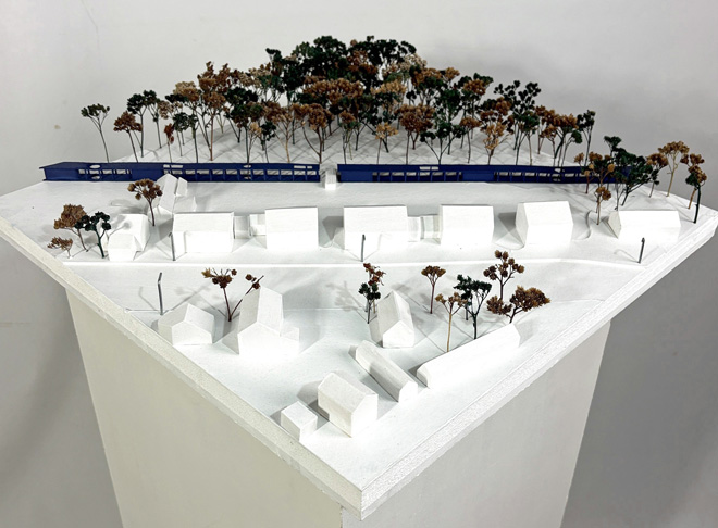 Maxhütte-Haidhof, ein Ort, den Hammerl seit ihrer Kindheit kennt, diente ihr als exemplarisches Untersuchungsgebiet. Wie viele ländlich geprägte Kommunen ist auch er von Zersiedelung betroffen. Vor diesem Hintergrund entwickelte sie in ihrer Masterarbeit mit dem Titel „Rhythmus der Peripherie – Neue Strukturen im Dialog mit dem Bestehenden“ vier konzeptionelle Ansätze zur Nachverdichtung, die sowohl bestehende als auch unbebaute Flächen einbeziehen.