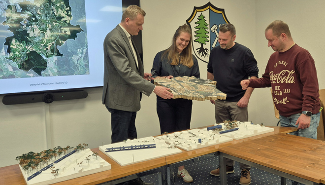MAXHÜTTE-HAIDHOF (sr). Im Rathaus Maxhütte-Haidhof stellte die angehende Architektin Franziska Hammerl ihre Masterarbeit mit dem Titel „Rhythmus der Peripherie – Neue Strukturen im Dialog mit dem Bestehenden“ vor. Sie stellte dies anhand der Stadt Maxhütte-Haidhof dar. Anwesend waren Bürgermeister Rudolf Seidl, Bauamtsleiter Christian Cesarz sowie Bauamtsmitarbeiter Ludwig Berg.