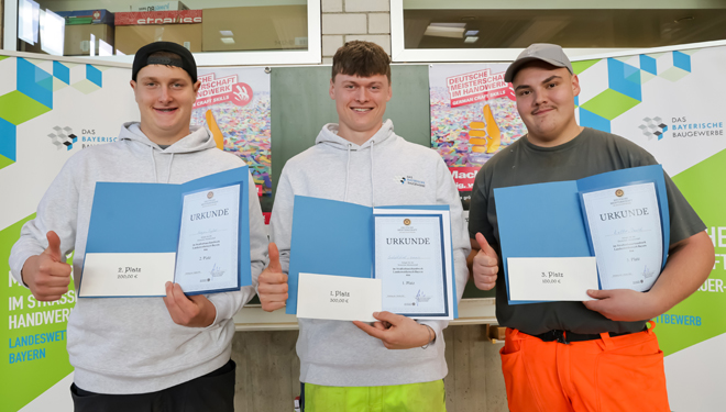 Das Besondere am dualen Studiengang Bauingenieurwesen ist, dass die Studierenden neben dem klassischen theoretischen Studium zusätzlich eine handwerkliche Ausbildung abschließen. Es ist somit die ideale Verbindung zwischen Handwerk und Theorie, findet Louis. „Man lernt etwas im Unterricht und sieht es am nächsten Tag auf der Baustelle. Das ist ein ganz anderes Verständnis als bei einem rein theoretischen Studium.“ Er betont, dass man sich den Respekt auf der Baustelle erarbeiten muss, unabhängig von der Position. „Wer selbst mit anpackt, versteht, wie der Bau wirklich funktioniert.“ Diese Haltung trug ihm den Titel des „Bayerischen Meister-Azubis Straßenbauer“ ein – ein absolutes Highlight seiner bisherigen Ausbildung.