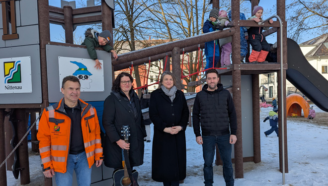 NITTENAU (sr). Viele Nittenauerinnen und Nittenauer haben sehnsüchtig darauf gewartet, nun ist es endlich soweit: Der neue Spielplatz am Rathaus in Nittenau wurde am 20. Februar 2026 offiziell eröffnet. Den ersten „Testlauf“ durften die Kinder des Kindergartens St. Josef übernehmen. Kletterturm, Rutsche, Nestschaukel und viele weitere Spielgeräte wurden trotz der winterlichen Wetterbedingungen sofort in Beschlag genommen.