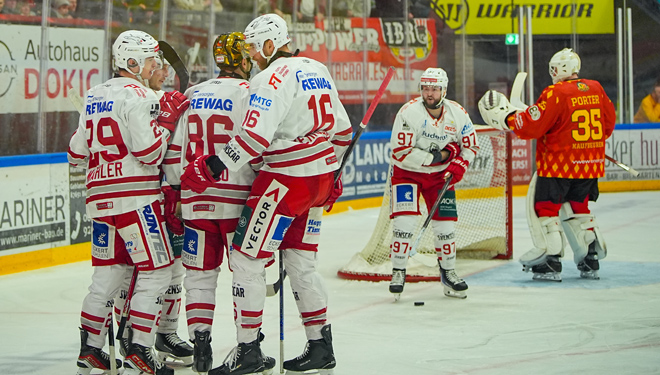 In diesem behielten letztlich die Oberpfälzer die Oberhand und gewannen letztlich mit 4:3 (2:0/0:1/1:2/0:0/1:0). Vor 1944 Fans in der Energie-Schwaben-Arena hatten sich die Gäste im ersten Durchgang einen verdienten 2:0-Vorsprung herausgespielt – Nick Mähler mit seinem ersten Profi-Tor (6. Minute) und Alexander Berardinelli (16.) hatten getroffen. Im Mitteldrittel wurden dann die Allgäuer stärker und verkürzten in Überzahl durch Max Kislinger auf 1:2 (34.). Als Henri Kanninen nach 44 Minuten für die Buron Joker gar zum 2:2 ausglich, drohte die Partie zu kippen. Doch Donát Péter brachte die Domstädter kurz darauf wieder in Front (3:2 – 47.). Als der ESVK in der Schlussphase mit einem sechsten Feldspieler statt ihres Goalies auf das 3:3 drückte, wurde 62 Sekunden vor der rettenden Schlusssirene der Druck zu groß: Kaufbeurens Kapitän Bernhard Ebner hämmerte den Puck zum abermaligen Ausgleich ins Eisbären-Tor. Die Die Overtime blieb torlos, im fälligen Shootout netzte einzig Regensburgs Sturm-Neuzugang Jeremy Bracco ein und sicherte den Rot-Weißen damit den Zusatzpunkt.