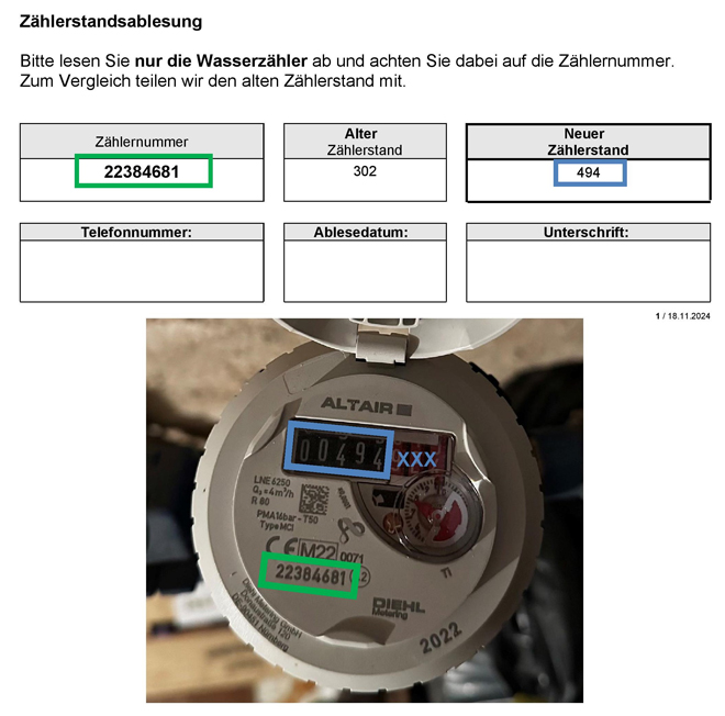 Wichtig ist zunächst der Abgleich der Zählernummer auf dem Ablesebrief (auf der Abbildung grün markiert). Bei der Ablesung bitte nur die bis zu 5-stellige Zahl auf schwarzem Untergrund ablesen und übermitteln. Die Zahlen auf rotem Grund nicht angeben.