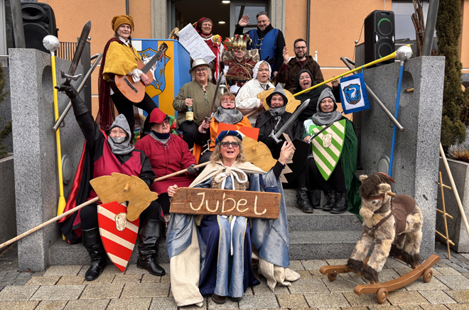 TEUBLITZ (sr). Am Unsinnigen Donnerstag verwandelte sich der Marktplatz vor dem Rathaus in Teublitz in eine mittelalterliche Bühne. Mit ihrem Schlachtruf „Blitzi, Blitzi, Teu, Teu, Teu“ stürmten die „Narrischen Weiber“ traditionell das Rathaus und entmachteten symbolisch Ersten Bürgermeister Thomas Beer. Im Mittelpunkt des diesjährigen Programms stand ein großes Ritterturnier, das zahlreiche Besucherinnen und Besucher anzog.