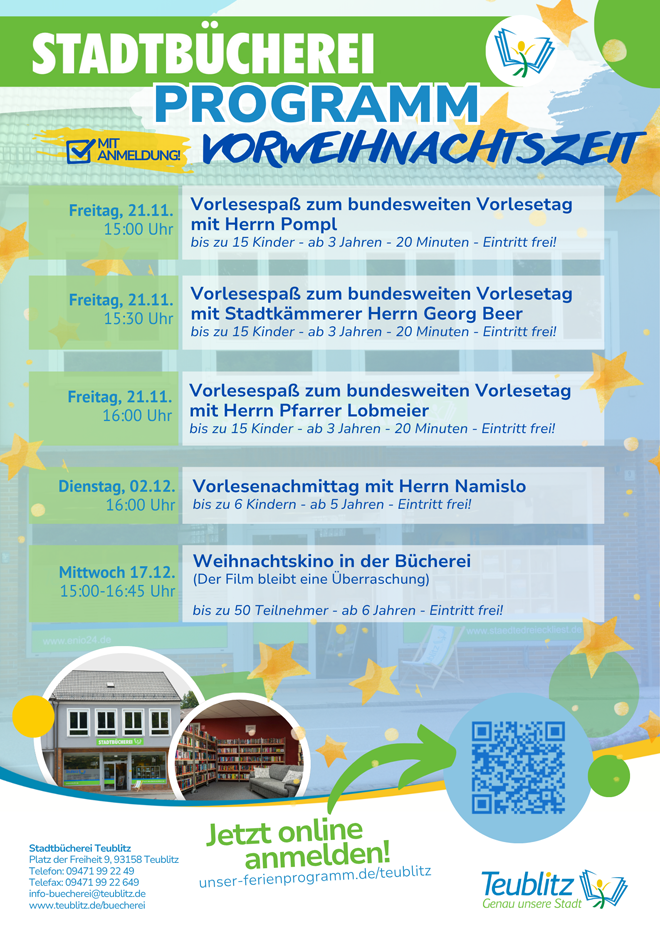 Im Mittelpunkt des diesjährigen vorweihnachtlichen Programms steht der bundesweite Vorlesetag am Freitag, den 21. November 2025. An diesem Tag heißt es gleich dreimal „Ohren auf und zuhören!“. Verschiedene Vorleser sorgen für abwechslungsreichen Lesespaß. Den Auftakt macht um 15.00 Uhr Herr Pompl. Um 15:30 Uhr übernimmt Stadtkämmerer Georg Beer, bevor Pfarrer Lucas Lobmeier um 16.00 Uhr den Abschluss bildet. Jede Lesung dauert rund 20 Minuten und richtet sich an Kinder ab drei Jahren.