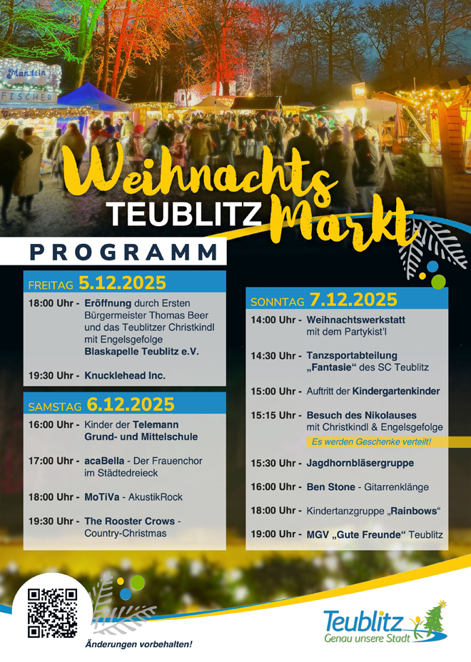 TEUBLITZ (sr). Der Duft von Knacker-Semmeln, Glühwein und gebrannten Mandeln zieht wieder durch den Teublitzer Stadtpark, denn es ist Weihnachtsmarktzeit! Vom Freitag, den 5. Dezember, bis Sonntag, den 7. Dezember 2025 verwandelt sich der Stadtpark erneut in ein stimmungsvoll beleuchtetes Weihnachtsdorf mit liebevoll geschmückten Buden und einem abwechslungsreichen Rahmenprogramm für die ganze Familie.