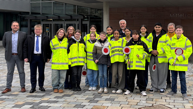Bürgermeister Thomas Gesche gratulierte den frisch geprüften Schülerlotsen persönlich. „Ich bin stolz auf euch“, sagte er. „Ihr übernehmt Verantwortung für Jüngere und sorgt dafür, dass vor allem die Kinder der Hans-Scholl-Grundschule sicher zur Schule kommen.“ Diese Aufgabe sei alles andere als selbstverständlich.