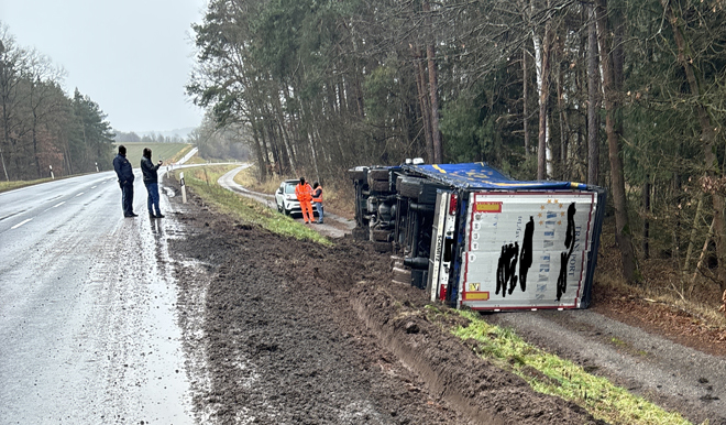 Kohlberg. Am Montagmittag befuhr ein polnischer Lkw-Fahrer mit seinem Sattelzug, beladen mit Glasplatten, die Staatsstraße 2172 von Weiden in Fahrtrichtung Hirschau. Ca. einen halben Kilometer nach der Falkenthalermühle geriet er mit seinem schweren Gefährt von der Straße ab und auf das aufgeweichte Bankett. Der Fahrer konnte das Gespann dann nicht mehr auffangen und rutschte einen 2 Meter tiefen Graben hinab und kippte schließlich nach etwa 50 Metern auf die rechte Seite. Der Fahrer blieb zum Glück unverletzt. Am Lkw und an der Straßenböschung entstand ein Sachschaden i.H.v. 50000 Euro. Die Bergung musste durch eine Spezialfirma erfolgen. Die Straße war bis in die späten Abendstunden gesperrt, eine Umleitung wurde eingerichtet. Die Reinigung der Fahrbahn und die Verkehrsleitung wurde durch Kräfte der Feuerwehren Kohlberg, Etzenricht und Schnaittenbach übernommen.