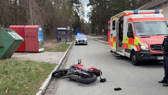 Am Dienstag, gegen 16:15 Uhr wurden Rettungsdienst und Polizei in die Bahnhofstraße, nach Wackersdorf, zu einem Verkehrsunfall gerufen. Hier war ein 17-jähriger Deutscher, mit Wohnsitz in Fensterbach, alleinbeteiligt mit seinem Leichtkraftrad gestürzt. Am Fahrzeug entstand Sachschaden in Höhe von ca. 2.500,- €. Der junge Mann wurde mit dem Rettungsdienst in ein nahegelegenes Krankenhaus eingeliefert.