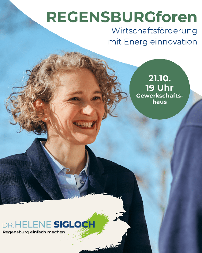 REGENSBURG (sr). Am 21. Oktober 2025 lädt Helene Sigloch zum ersten RegensburgForum ins DGB Gewerkschaftshaus (Richard-Wagner-Str. 2) ein. Das neue Veranstaltungsformat verbindet eine moderierte Diskussion mit Fachleuten und eine offene Fragerunde, in der das Publikum direkt mit den Beteiligten ins Gespräch kommen kann.